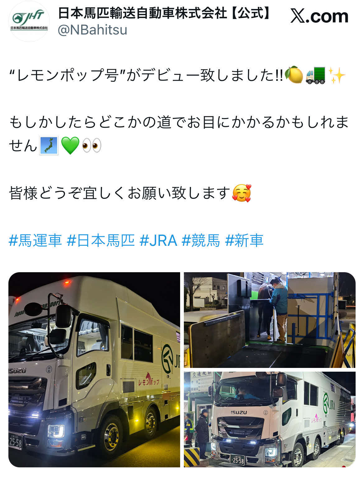 “レモンポップ号”がデビュー!馬運車会社が公式Xで紹介「どこかの道でお目にかかるかも」